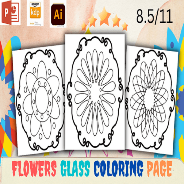 Flowers Glass Coloring Book Page, Birds, butterflies, frogs